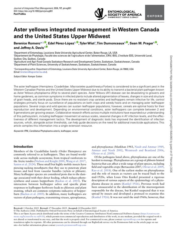 This is an overview of an open access article about aster leafhoppers and Aster Yellows in Western Canada and the US Upper Midwest. Some of the topics covered in this article include aster leafhopper biology, detection of Aster Yellows, and management practices for reducing its spread. It also contains a table summarizing several plant species that have been identified as hosts of this plant pathogen in the region (Table 1) and another table with information on testing facilities to submit samples to if you suspect that your plants might be infected with Aster Yellows (Table 3).